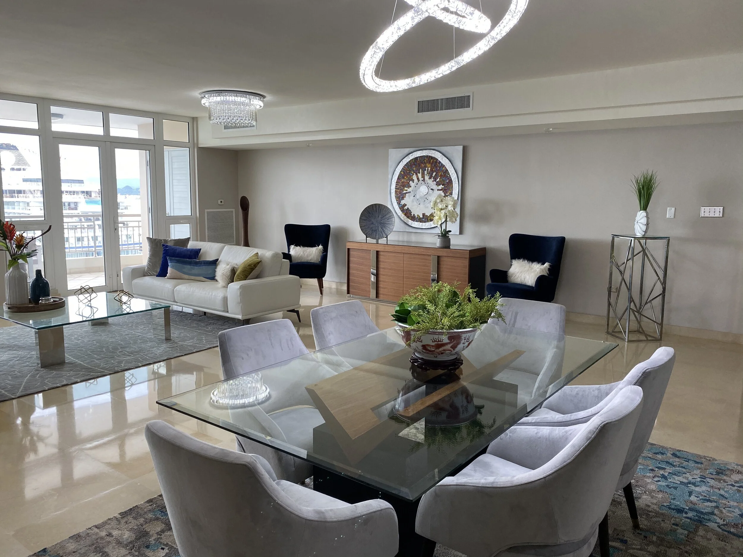 Luxury Apartment at Harbor Plaza. A stunning apartment, very spacious, completely furnished, magnificent views of San Juan Bay, perfect Old San Juan location, walking distance to banks, pharmacies, supermarket, stores, bars restaurants and all in the comfort of a luxury building with full power generators, water cistern, 24/7 security, three covered side by side parking spaces and storage area. The apartment has three bedrooms, all with private bathrooms, one half bathroom, walk-in closets, separate laundry room, entertainment/family area, large balcony, fully equipped kitchen and large pantry.